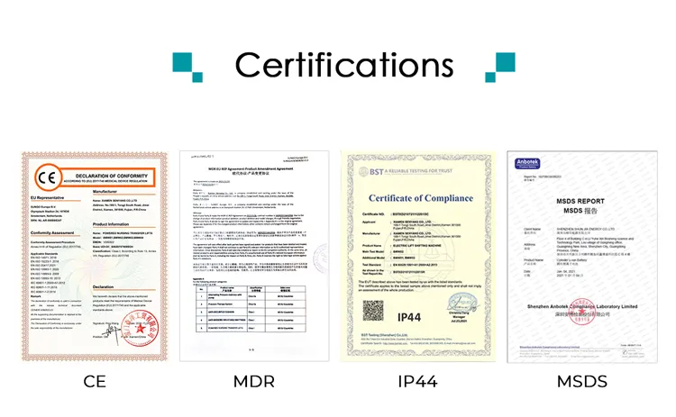 Sie können sicher sein, dass der Transfer Chair von Senyang FDA- und CE-zertifiziert ist, was unser unermüdliches Engagement für die Einhaltung der höchsten Industriestandards unterstreicht. Diese Zertifizierung zeigt, dass wir uns für die Sicherheit unserer geschätzten Kunden einsetzen.