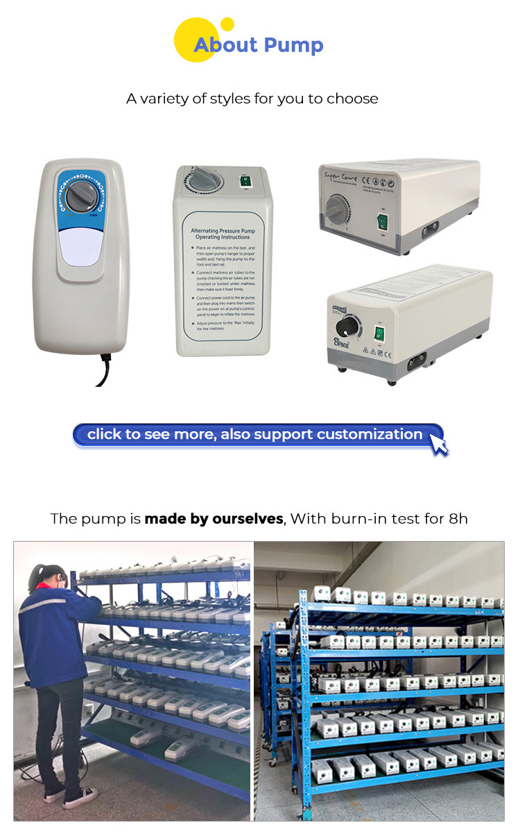 Lorsque les gens achètent des matelas médicaux, ils doivent également vérifier la pompe à air du matelas. Si le matelas médical gonflable est de bonne qualité, la pompe à air ne fera pas de bruit et n'affectera pas le sommeil du patient. La pompe à air d'un matelas médical gonflable de mauvaise qualité peut faire beaucoup de bruit et affecter le sommeil du patient. La pompe à air médicale fabriquée par notre société a un faible niveau sonore et un noyau de pompe fabriqué par nos soins, avec une qualité garantie.