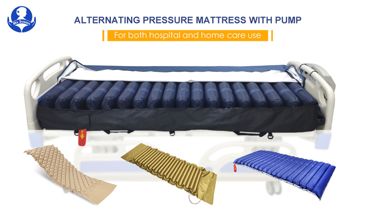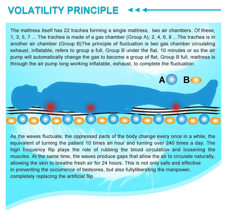 Les matelas gonflables médicaux sont généralement dotés de deux cellules d'air. Les deux cellules d'air se gonflent et s'évacuent circulairement, et l'alternance AB permet d'obtenir un effet de massage fluctuant, de manière à modifier continuellement la zone de stress du corps humain, à accélérer la circulation sanguine du corps humain et à obtenir un effet de prévention des escarres.