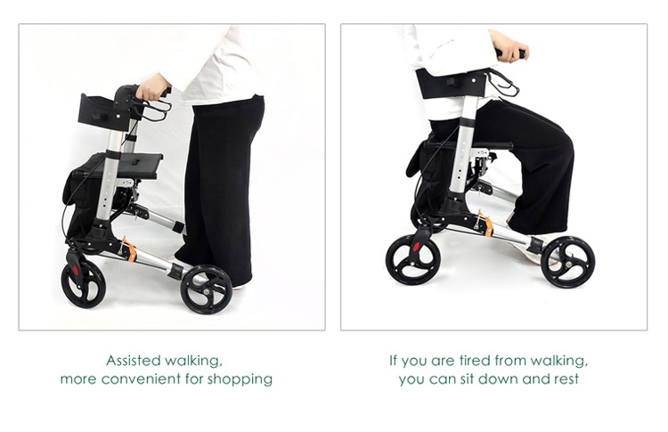 The classic four-wheeled rollator provides stability and easy mobility, and helps increase walking speed. However, it does require steering and easy hand brake operation which may not be suitable for all users. The rollator also comes with a seat for resting during longer walks, and a basket for carrying personal belongings, most of the time located under the seat. it is worth noting that most rollators do not have trays on them.