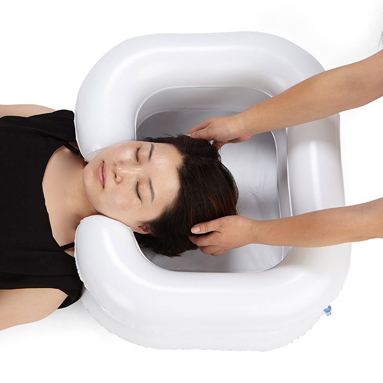 Put a rubber horseshoe-shaped cushion on the back of the neck of the elderly so that the neck rests on the protrusion. The head should be in the center of the shampoo sink, and the lower part of the sink should be connected to the sewage bucket.